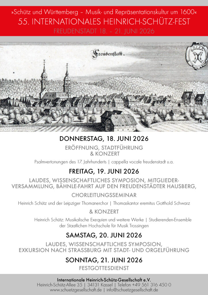 Das 55. Internationale Heinrich-Schütz-Fest führt die Internationale Heinrich-Schütz-Gesellschaft in diesem Jahr in die Schwarzwaldstadt Freudenstadt, die 1599 von Herzog Friedrich I. von Württemberg gegründet wurde. Im selben Jahr trat Heinrich Schütz zur Ausbildung als Kapellknabe in das Collegium Mauritianum in Kassel ein. Wenig später verhandelte Landgraf Moritz von Hessen, Schütz’ Entdecker und Förderer, mit dem Stuttgarter Orgelbauer Conrad Schott über eine Orgel für seine Residenz. Zwar kamen diese Verhandlungen nicht zum Abschluss; doch spricht manches dafür, dass es sich bei der dabei in Rede stehenden Orgel um jenes Instrument handelt, das Herzog Friedrich I. wenig später für die neu errichtete Kirche in Freudenstadt bauen ließ.